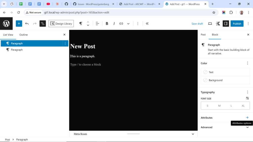 Notice in the screenshot below that we have a paragraph block selected and in the block settings tab there is an attributes panel that appears.